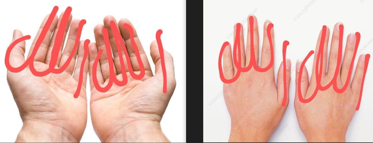 [1.73] Picture above emphasizes Islam's belief that the human body bears a distinct mark of divine creation, evident in the resemblance of the hands to the Arabic calligraphy for Allah (s.w.t) (God). This perspective underscores Islam's unique monotheistic principle (Tawhid) and suggests that other faiths lack comparable tangible indications of their deities within the human form. By highlighting this perceived evidence of Allah's presence in physical creation, the statement reaffirms Islam's assertion of a clear and unequivocal path to understanding and worshiping the true God.