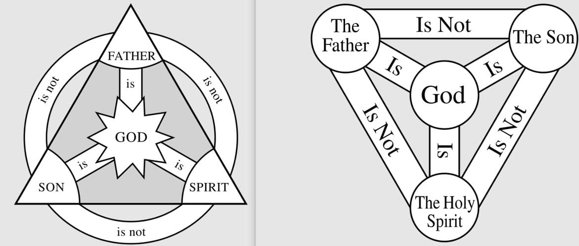 [1.67] According to the Trinity doctrine, the Father, the Son (Jesus, peace be upon him), and the Holy Spirit are each considered fully God, yet they are distinct from one another. The Father is said to be God, yet not the Spirit or Jesus (pbuh). Similarly, the Spirit is considered God but not the Father or Jesus (pbuh). Lastly, Jesus (pbuh) is acknowledged as God but not the Father or the Spirit. This theological concept attempts to reconcile the belief in one God with the three distinct persons of the Trinity, depicted in the Trinity logo as one being in three characters.