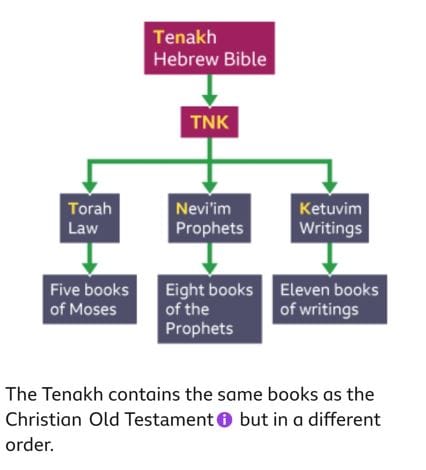 - Tenakh/Old Testament: Includes history, laws, poetry, prophecy, and wisdom literature for Jewish life.